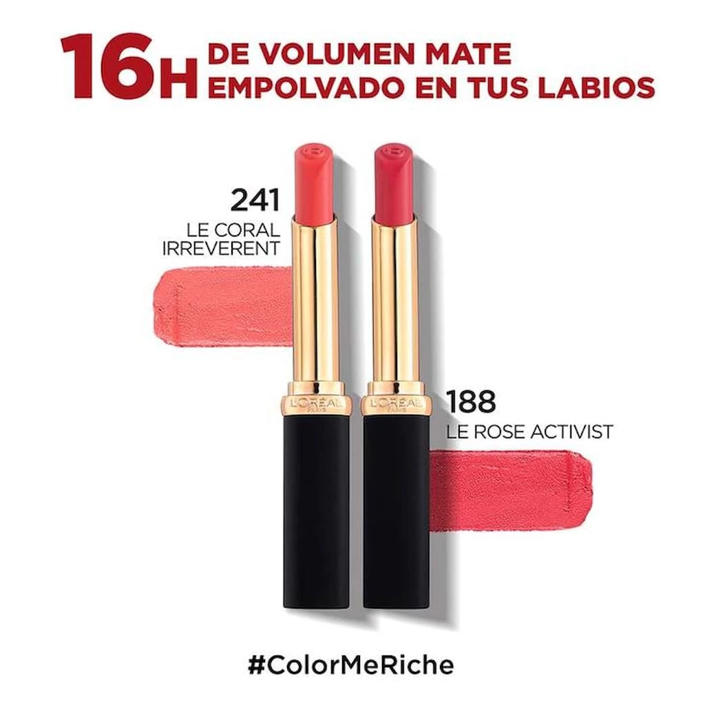 El nuevo Labial Color Richie de L'Oréal Paris llega con una formula mejorada enriquecida con acido hialuronico que va a brindar volumen e hidratacion a los labios a su vez que deja un acabado mate impecable de larga duracion, que va a durar 16 horas y no se transfiere.
