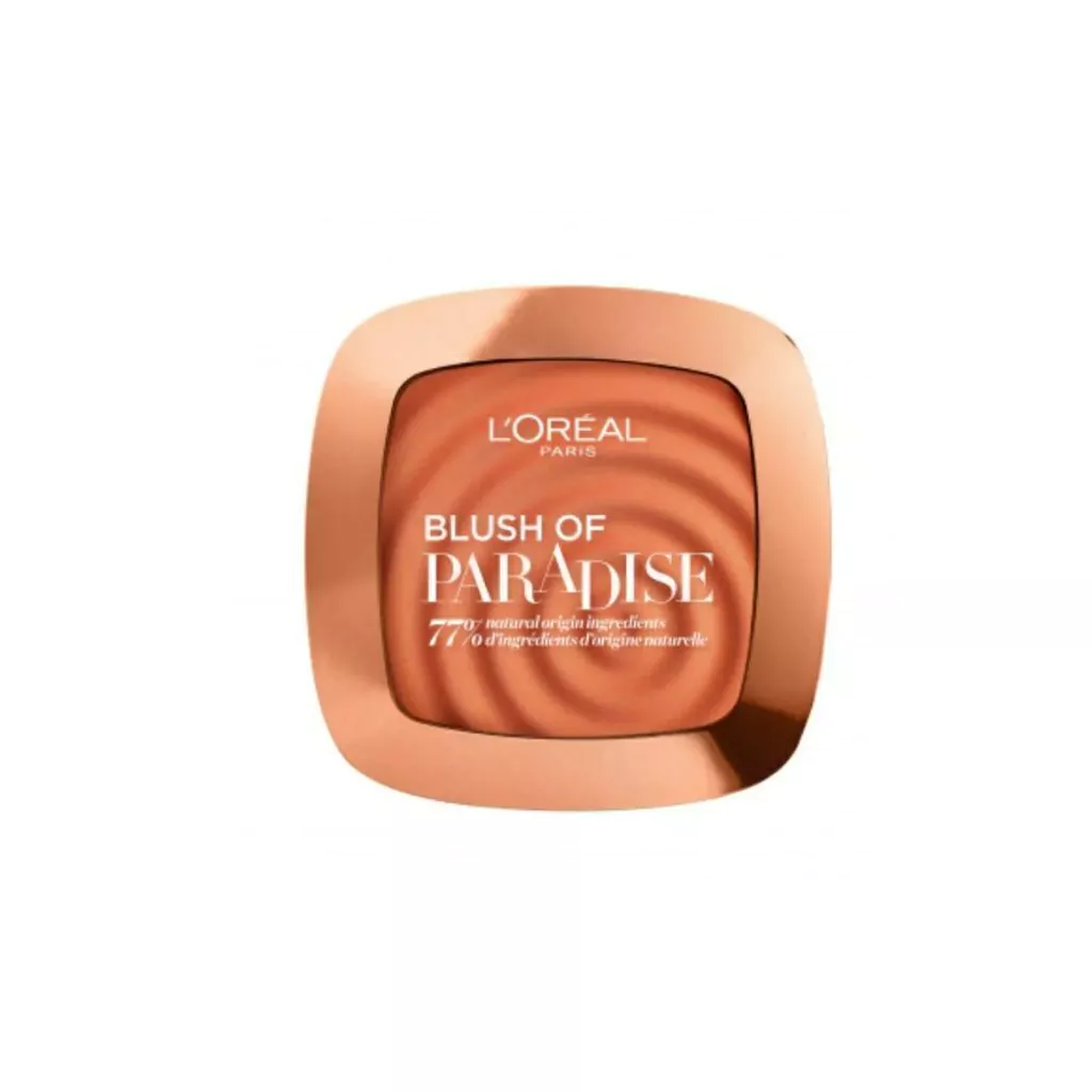 El rubor Paradise de L'Oreal Paris pose un 96% de ingredientes de origen natural; se encuentra infusionado con aceites de coco, melocoton, mantecas de cacao y mango; va a aportar un toque de color para lograr un acabado naturar en tu piel y un aroma espectacular. Busca darle un color sutil a las mejillas del rostro como si recien te hubieses expuesto al sol.